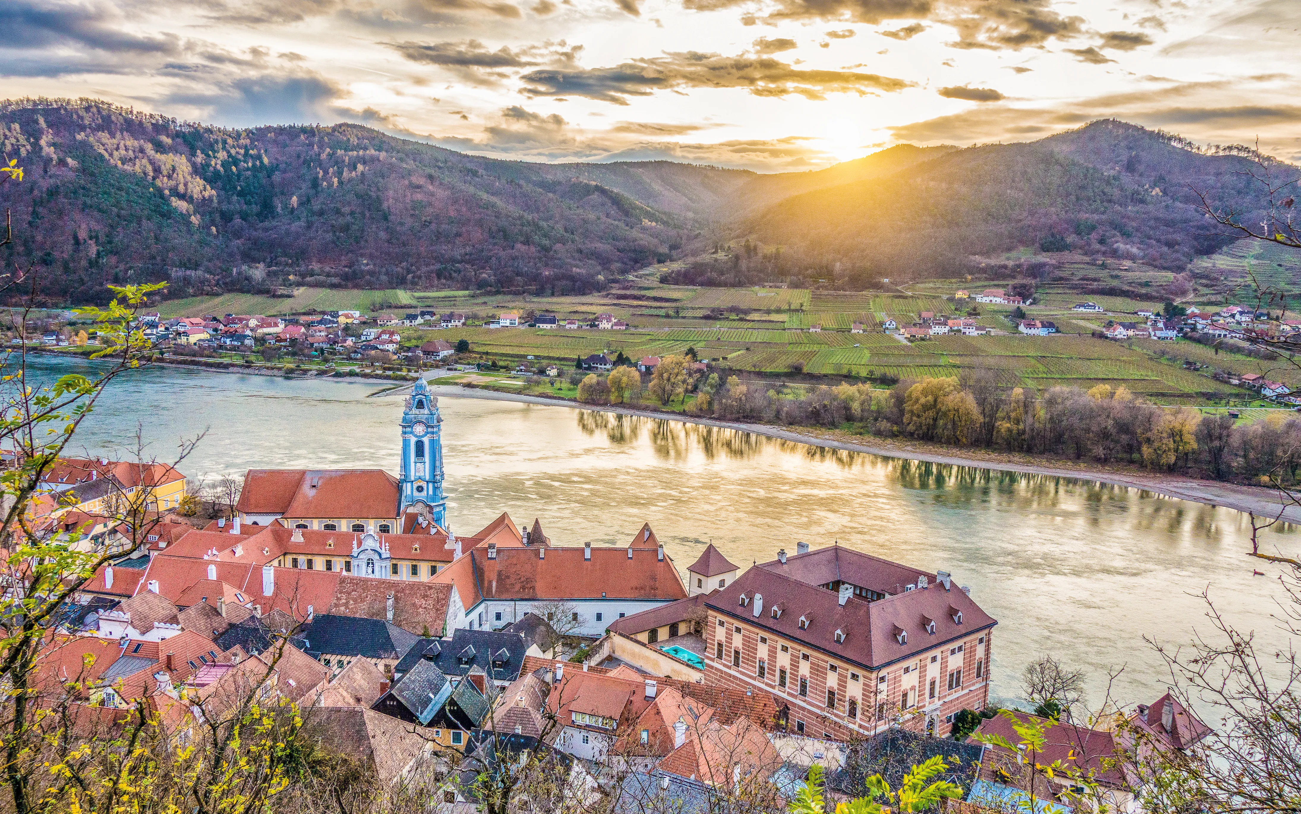 Das Bild zeigt einen malerischen Moment in Dürnstein, einer kleinen Stadt im Wachau-Tal in Österreich, an der Donau.